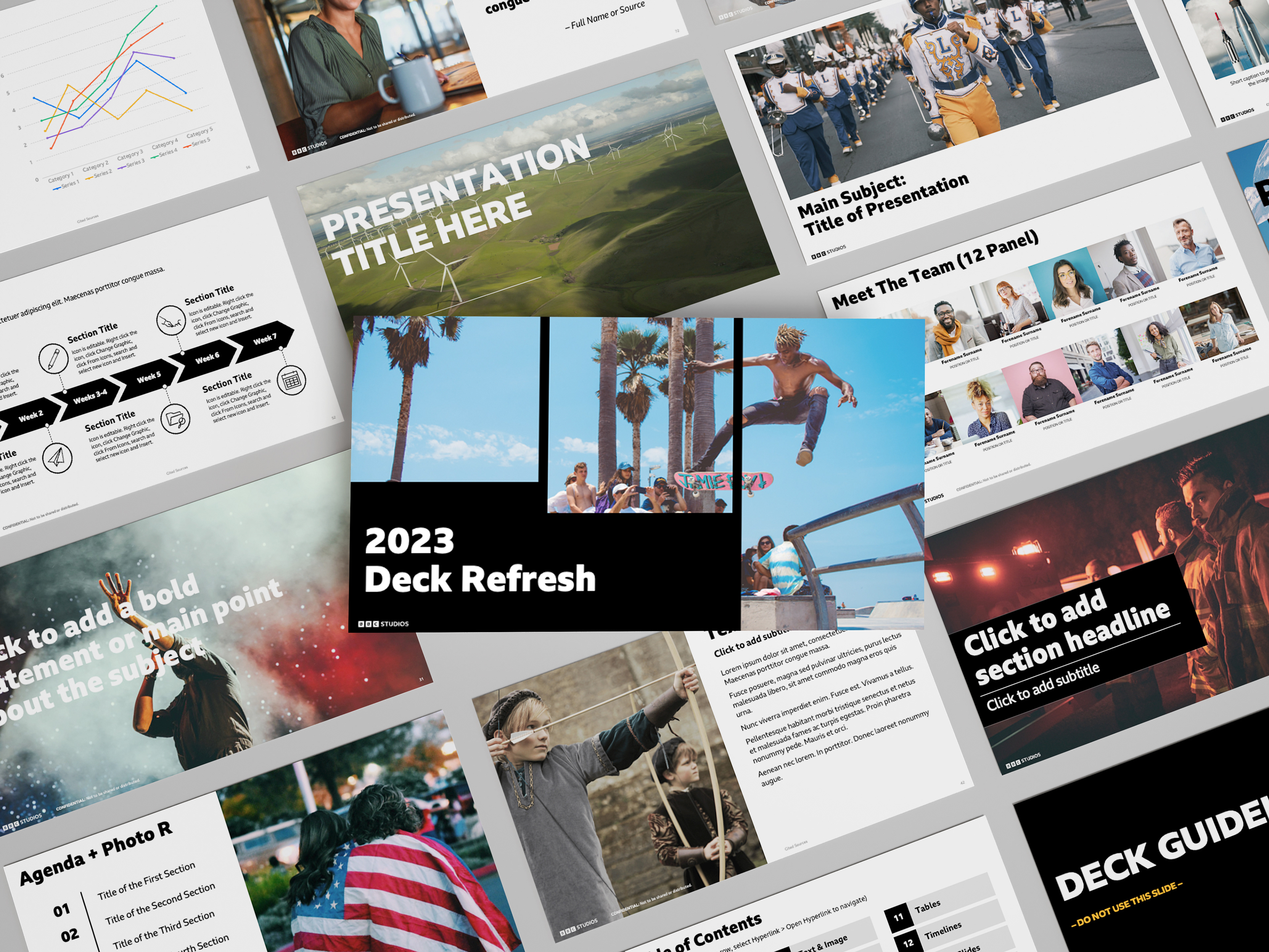 To begin, we audited a collection of decks from BBC Studios staff members of varying skill levels to better assess what was in circulation at the time. It was important to identify the tools and methods that were being used, as well as any pain points that could be solved. We then collaborated with stakeholders through three rounds of revisions until we solidified the new design.